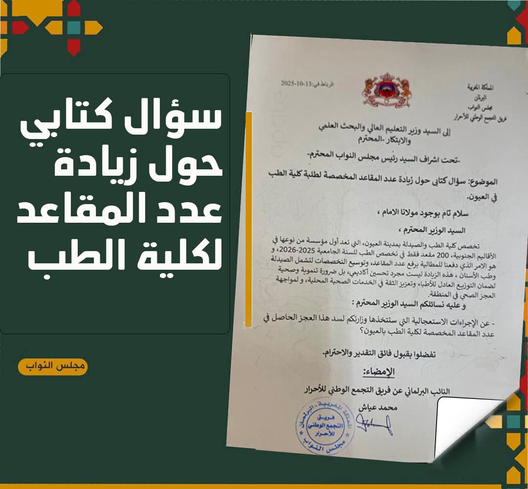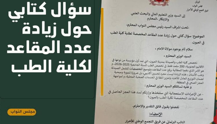 وقال البرلماني في سؤاله بأن كلية الطب والصيدلة بمدينة العيون هي أول مؤسسة طبية من نوعها في أقاليمنا الجنوبية لكنه تفاجأ بتخصيص 200 مقعد فقط لتخصص الطب للسنة الجامعية 2025-2026.