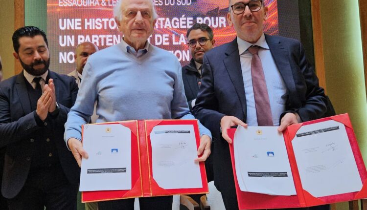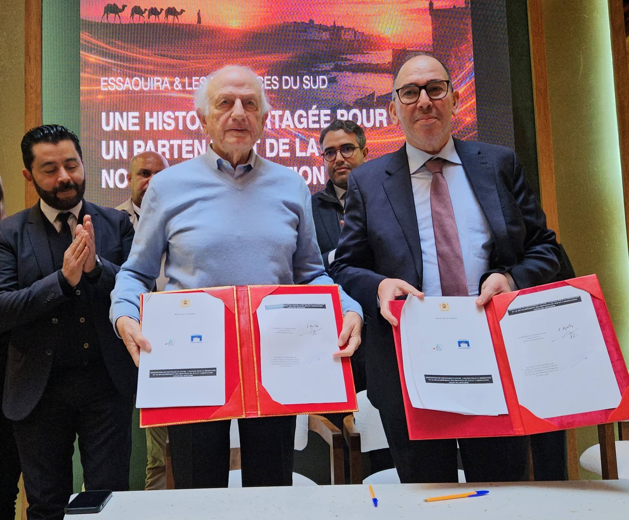 وقع جبران الركلاوي عن وكالة تنمية الأقاليم الجنوبية (وكالة الجنوب) وأندري أزولاي مستشار صاحب الجلالة والرئيس المؤسس لجمعية الصويرة موكادور اتفاقية إطار على هامش الدورة التاسعة لمهرجان “جاز تحت الأركان”.